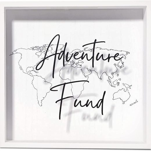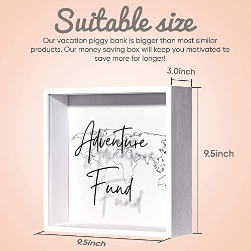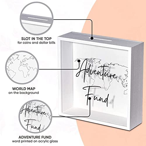Mysu Designs, Adventure Fund Box, White Shadow Box Bank Travel, Acrylic Glass & Wooden Piggy Banks for Adults, Vacation Fund Saving Money Box, Honeymoon Fund Savings Box, Wedding Gifts, Travel Fund