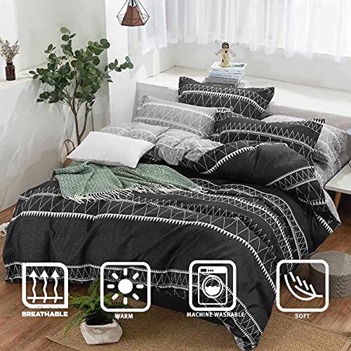 Nanko Queen Duvet Cover Set Black Boho Geometry Striped Triangle Pattern Print 3pc 90 x 90 Soft Microfiber Down Comforter Bedding Cover with Zipper Ties – Gray Bohemian Modern for Men and Women Teen