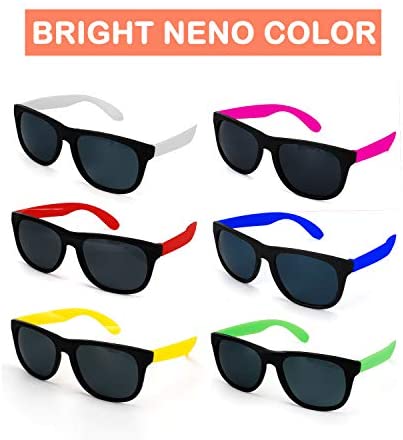 Content:36 pack party sunglasses with 18 colors. Feature: 18 various colors,super bright and vivid. Size: 5.5 Recommended: 6 years old and ups. Use for: Perfect for outdoor party, birthday party,graduation party,classroom prize,giveaway carnival prize, grgoody bag toy, holiday gift, dress up and entertainment. Safe: Sunglasses made of high quality plastic that is very environmentally friendly and safe.