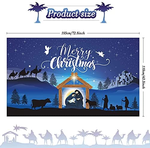 Nativity Banner Merry Christmas Nativity Barn Birth of Jesus Nativity Backdrop Scene Blue Large Holy Nativity Backdrop Religious Xmas Photography Booth Prop Banner for Christmas Party 72.8 x 43.3 Inch