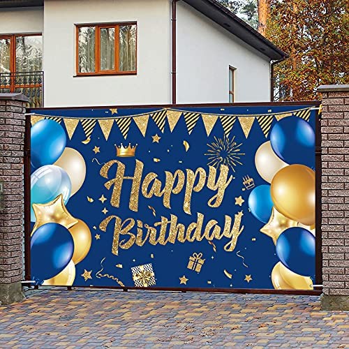 [HAPPY BIRTHDAY PARTY BACKDROP FOR MEN]- Happy birthday banner is designed with navy blue and gold balloons, fireworks, gift boxes pattern, and eye-catching gold ‘’Happy Birthday letter. It would be an impressive decoration for a blue theme birthday party, boys birthday party [LARGE HAPPY BIRTHDAY BACKDROP BANNER]-Large blue gold birthday yard banner measures 180*110cm/70.8*43.3 inches, which is quite suitable for garden yard party decoration, photo backdrop background [QUALITY MATERIALl]-blue birthday decoration backdrop is made of durable polyester, which is lightweight, foldable, and washable. it can be reused for a long time [EASY TO HANG] The blue birthday party backdrop comes with a white long rope, and there are 4 copper buckles in the corner. its convenient for you to hang the birthday background banner anywhere [WIDELY APPLICATION]- The birthday background banner can be used to decorate various occasions, such as different themed birthday parties, photography props, home garden yard party decorations