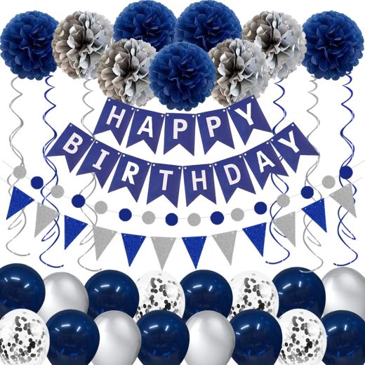 Navy Blue Silver Birthday Decorations, Happy Birthday Party Supplies for Men Women Boys with HAPPY BIRTHDAY Banner, Tissue Paper Flowers Pom Pom, Pennant, Circle Dot String, Latex Balloons