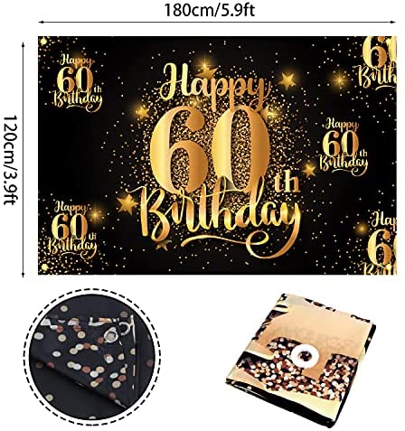 NC Happy 60th Birthday Backdrop Banner Step and Repeat 60 Years Old Background Decorations for Women Men Her Him Photography Party Supplies Glitter Black Gold