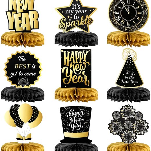 BEAUTIFUL 9 DIFFERENT VARIETY OF GLITTER NEW YEAR HONEYCOMB : Looking for new years eve centerpieces We have got you covered with this New Years Eve centerpieces decoration set that includes the adorable pack of 9 New Years Honeycomb in black and gold. You will receive 9 set of glitter new year honeycomb centerpiece decorations in different designs, including 9 honeycomb centerpieces, very suitable for happy new years table decorations. 3D HONEYCOMB CENTERPIECES WITH INSPIRATIONAL QUOTES : Each table toppers for party is about 6 x 7.5 inches, which is a suitable size to ornament the party table top, adding festival atmosphere by setting these gold and black new years party supplies 2022 for the New Years Eve cheers; In the middle of the table, you can place with various styles, motivational sayings, as Balloons, top hats, clocks, light bulbs, garlands. MINIMUM EFFORT AND MAXIMUM RESULT NEW YEARS EVE PARTY FAVORS : The decorative new years centerpieces for tables come flat packed for better protection, and they are easy to be assembled. Just connect the two sides together to make a Desired shape. Unfolded the tissue honeycomb for new year table decorations, pull around both sides edge and align, stick both sides together or staple it then you can reuse it.It comes with ribbon to hang happy new year decorations 2022 HIGH QUALITY| STURDY | REUSABLE LARGE PAPER NEW YEARS EVE DECORATIONS FOR TABLE : These new years eve party supplies 2022 table decoration adopt quality paper, which is reliable and fadeless and sturdy; The double-side printed party honeycomb centerpieces are easy to store and fold, having a long time for using; These New Year honeycomb table centerpieces are sturdy so that you can use them with confidence. MULTIPLE APPLICATION | PICTURE PERFECT TABLE DECOR : These new years eve table centerpieces honeycomb table toppers have a wide application for the New Year party decoration, such as party supplies, ceiling and table decorations, window display, desktop decor and so on; You can also use them to be new years table decorations.you can use these table centerpieces as photo props to take memorable pictures with your friends and family, which is a nice way to welcome the New Year together.