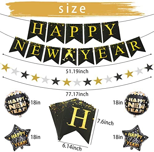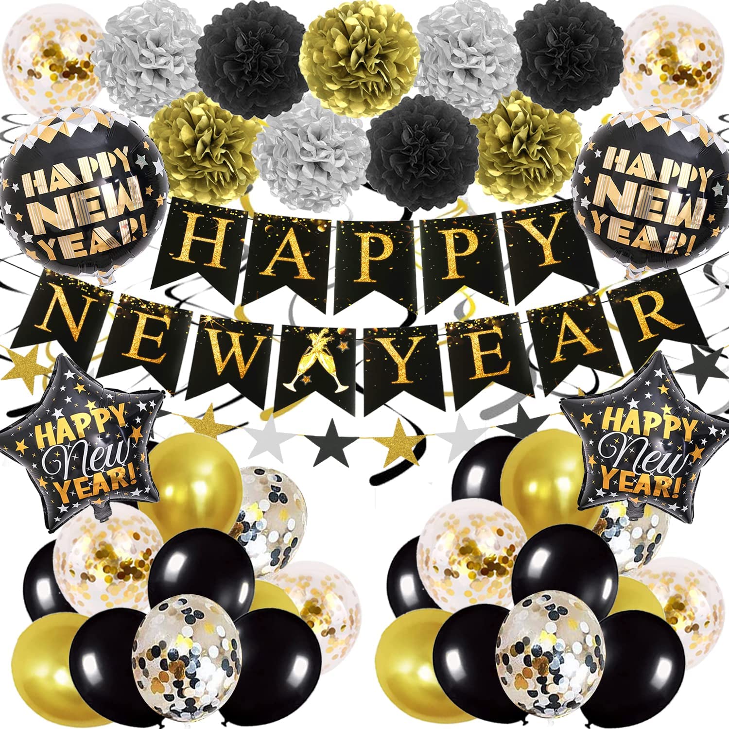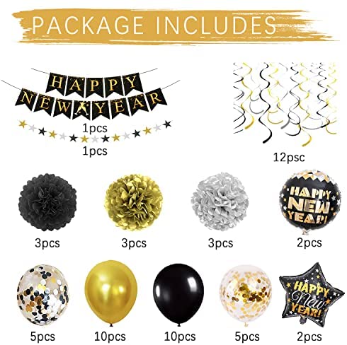 New Years Eve Party Supplies 2022- 47 Pcs Happy New Year Decorations Kit,Includes Happy New Year Banner, Gold Black Happy New Year Foil Balloons for Happy New Year Decorations 2022 Black Gold Happy New Year Decor
