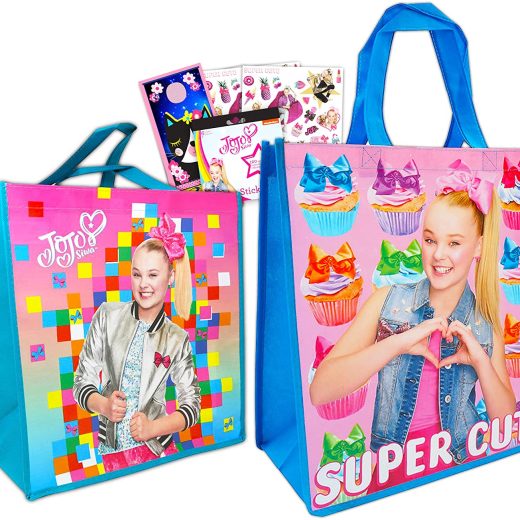Nickelodeon Jojo Siwa Tote Bag Set Jojo Siwa Party Supplies – 2 Pack Jojo Siwa Party Favor Bag for Kids Nick Jr Jojo Siwa Party Decorations (Jojo Siwa Bag Set). This Nickelodeon Jojo Siwa tote bag set includes 2 Jojo Siwa tote bags featuring iconic Jojo Siwa art works. Reusable bag set includes 2 Jojo Siwa tote bags 1 measuring 13 x 13 x 5 and another measuring 16 x 13 x 6 featuring some of you favorite Nickelodeon character Jojo Siwa. Sure to delight any and all Jojo Siwa fans of all ages; boys and girls alike. Officially licensed Nickelodeon Jojo Siwa reusable grocery bags. Includes bonus JoJo Siwa stickers and a cat door hanger.