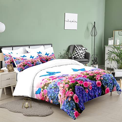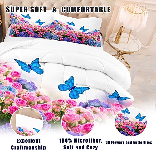 NINENINE Flowers and Butterflies Comforter Sets Full for Boys Teens,3D Flowers and Butterflies Bedding Set,Soft Microfiber Reversible Quilt with Matching Pillowcase,Full Size#5003