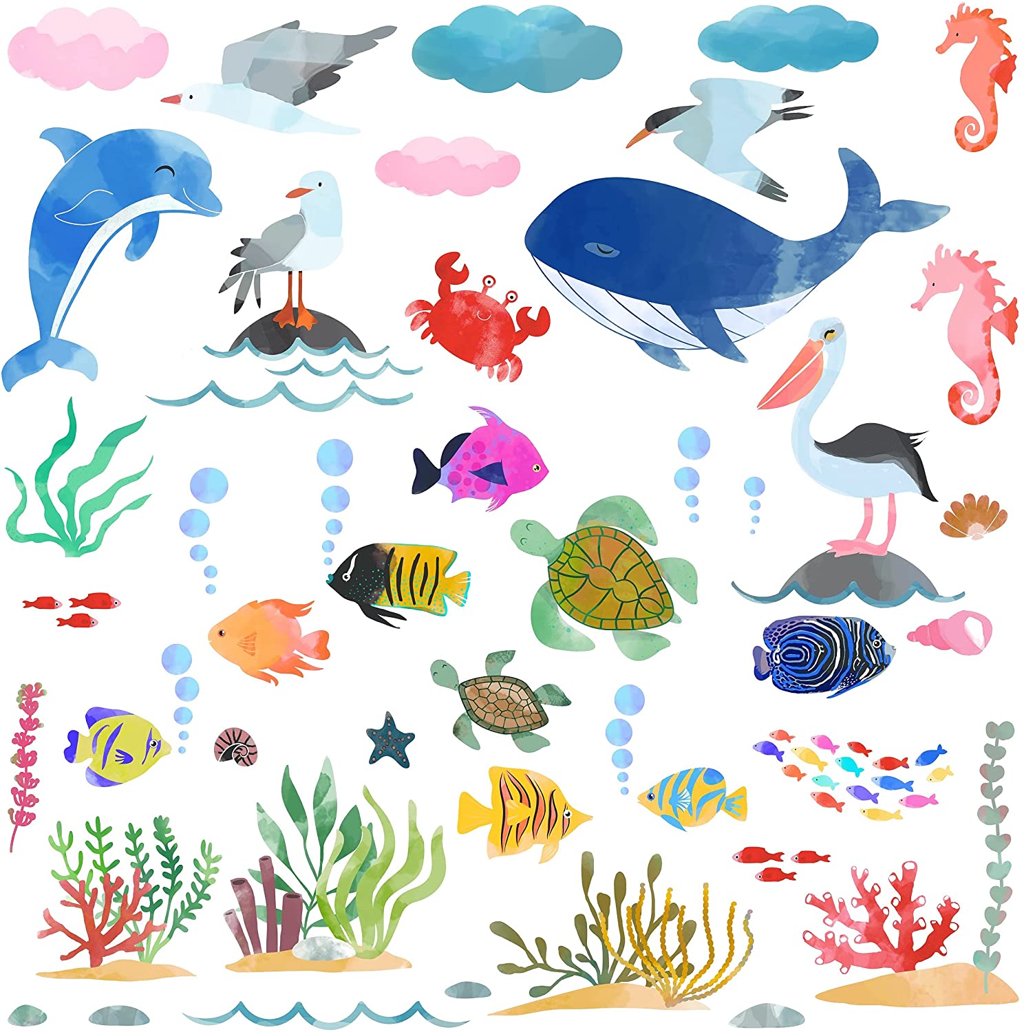 Ocean Animals and Seabirds Nursery Peel & Stick Wall Decals for Boys and Girls
