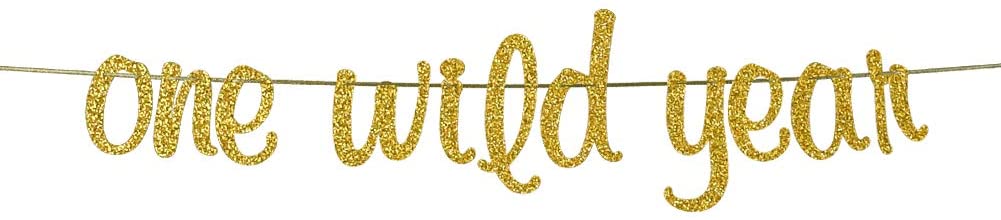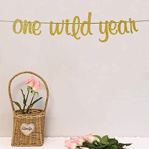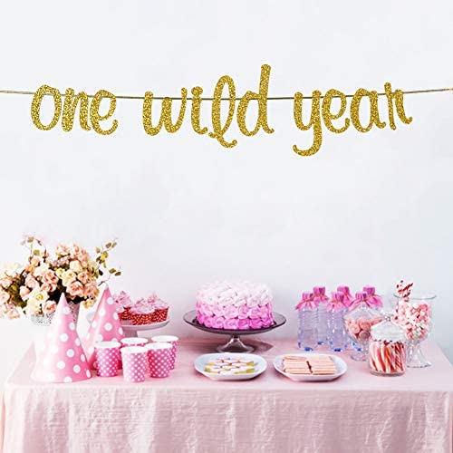 One Wild Year Banner for Baby Boy Girl First Birthday Party Decorations Gold Glitter