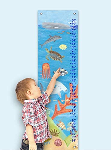 Children will love exploring the wonders of the ocean as you mark their height on this ocean growth chart for kids. Height charts are a great way to create a keepsake for you to treasure, and since each growth chart from Oopsy daisy is printed on durable canvas, youll treasure it for years to come. Handcrafted in the USA. Great for gifts – comes packaged in a signature gift box for easy gift-giving. Easy to clean – wipe with a soft damp cloth. Kids growth charts can also be ironed on low heat if need be. Durable – printed on artist grade premium canvas. All height charts measure 12×42 with a grommet placed in each corner. A color-coordinated decorative cover is supplied that will fit over the screws or nails to create a finished look.