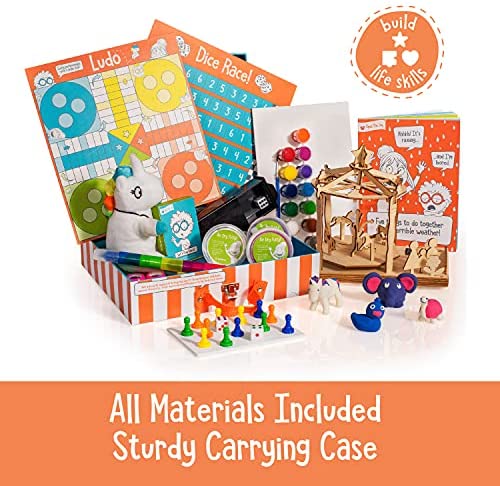 — : The rainy-day box is the perfect solution to an otherwise boring day stuck inside, either at home or on vacation. This all in one activity kit includes 3 board games, coloring, origami, magic, cards, painting, a wooden construction DIY project, playing cards, jokes, riddles and much more! : ?Over a weeks worth of activities and games in one box! – : ?This kit will be sure to make a day stuck inside fun and memorable! : Provides hours of entertainment that includes both independent play and family bonding activities. : Includes a 60+ page activity book that has jokes, riddles, games, doodling sheets, and more! : Beautifully packaged in a sturdy suitcase that can store all of the material for years. : Includes over 25 kindness missions to encourage kids to use the activities in this bag to make the people around them happy!