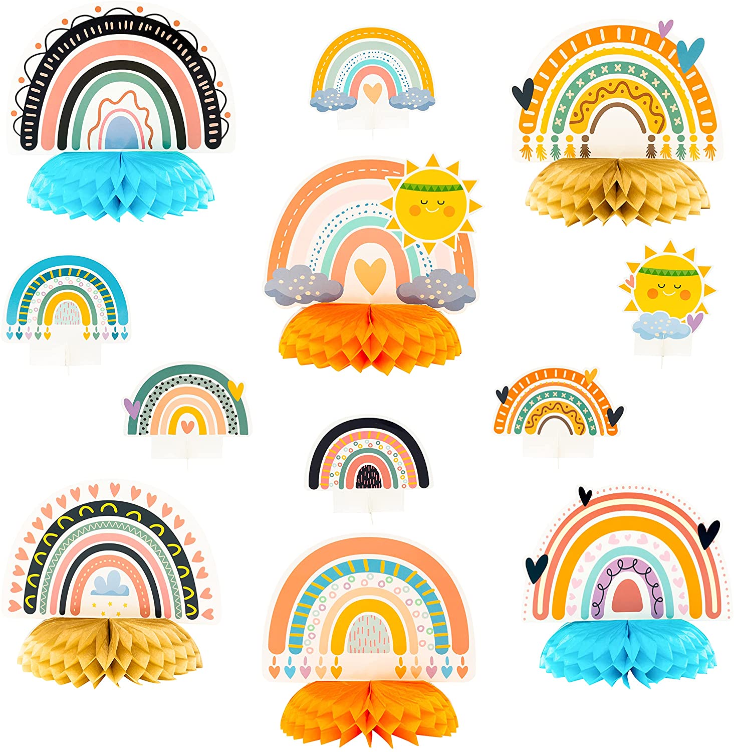 OSNIE 12Pcs Boho Rainbow Honeycomb Centerpieces Table Toppers Colorful Bohemian Rainbow Theme Party Decorations Supplies Photo Props for Neutral Baby Shower Kids Birthday Nursery Decor