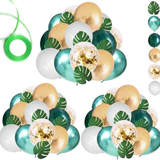 :VALUE PACK: 68pcs Jungle Balloon set, 15pcs green balloons, 10pcs metallic green balloons, 10pcs gold confetti balloons,10pcs metallic gold balloons and 10pcs white balloons, 12pcs palm leaves and 32ft balloon ribbon. : PREMIUM MATERIAL: Jungle baby shower balloons are made by high quality natural latex, harmlessness. Design own unique arch with our safari balloons and palm leaves thats very great decoration party. Shows a really different jungle safari party for your dear kids! :WIDELY APPLICATIONS Jungle safari themed balloons can be used in any party, such as baby shower, garden theme birthday, green forest and jungle animal party supplies, wild party,green shower, luau decorations, Hawaiian luau, photo shoot etc. Decorate the indoor or outdoor a booth backdrop create lasting memories, come to organize an unforgettable : PRE-CONFETTI CONFETTI BALLOONSThe use tip of this kind balloon is after full of air, shake it and gently rub it on your hair (the best way) or silk or wool to make the confetti stick to the side of the balloon, which can make the balloon look more beautiful. Also, you can pop up balloons and let the confetti fall, adding a lot of fun to the party! :90 DAY AFTER-SALE SERVICE : At There for You, our #1 priority is bring happiness to our guest! If you have any quality problems with our products, please contact us!