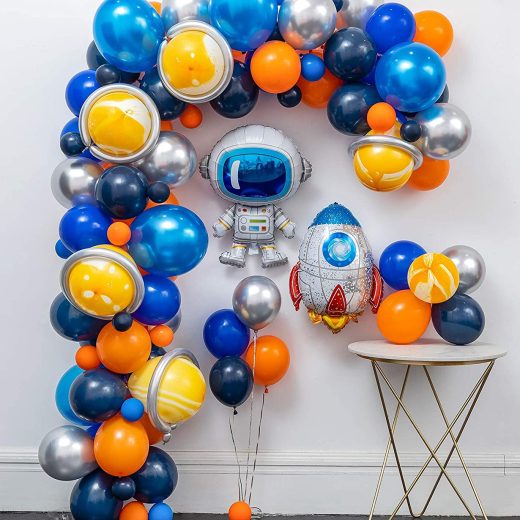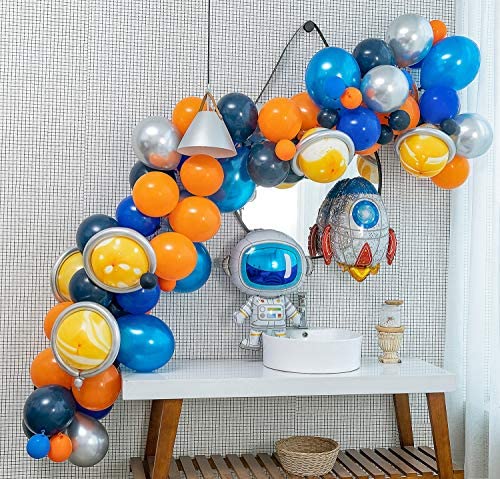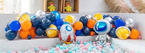 110 PCS PACKAGE INCLUDES:103pcs balloons&+7pcs Decorative tools .1pcs Rocket balloon.1pcs Astronaut balloon.5pcs Silver long magic balloons.5pcs Agate yellow balloons.7pcs Metal silver balloons12Pearlescent dark blue balloons(5pcs).10Deep blue balloons(10pcs).10Ink blue balloons(15pcs).10Hot orange balloons(14pcs).5Ink blue balloons(15pcs).5blue balloons(15pcs).5Hot orange balloons(10pcs)+Decorating Strip(16ft/Pcs),+Silver ribbons+Tying Tool+100 Points Stickers+3pcs Flower Clip. HIGH QUALITY:The balloons made with natural latex,non-toxic. Every balloons have been rigorously tested and selected manually. EXTRA THICK, unlike ordinary balloons, the color is more full and not explosive.The balloons can be Filled with Air, Helium or Water. MULTIPLE USAGE Easy to Use:The balloon decorating strip can make various types of balloon arches and garland.The BALLOON TIE TOOL can make the balloon knot quickly and it can release your hands and prevent sore.Use BALLOON Points Stickers makes it easy to fill the gap of balloons with smaller balo hang the balloon strip chain looks more gorgeous.Plum flowloons.;Use RIBBON ter shaped balloon petal clip, with the help of this accessory can make a very beautiful balloon flower shape. FIT FOR ALL OCCASION:This Outer Party Garland Set suit for wide scene. Perfect for baby showers, weddings, parties, banquets, birthday parties, anniversaries, celebrations, barbecues, opening ceremonies, etc. for indoor or outdoor activities.UFO Theme Party Supplies, Outer Space Party Prefabricated. CUSTOMER SERVICE: Please don’t hesitate to contact us if you have any quality problem.We will solve the problem for you until you are satisfied.If at any time you are not completely satisfied with your purchase feel free to return it to us for a full and prompt refund- No Questions.Your risk level is 0.