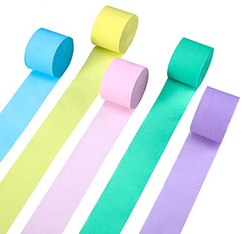 5 Rolls 1.77 inch pastel crepe paper streamers colorful crepe paper hanging decorations multicolored paper streamers for birthday wedding festival party supplies Features: Convenient to use: You can cut the paper into wanted size and shapes to diy your favorite paper crafts, hang it from ceilings to create a tent effect, twist the streamers together into spirals of color, or drape around furniture to personalize your party style, match different colored paper together for better presentation effect. Fits most occasions: Suitable for birthday party, wedding party, engagement, baby shower, anniversary, graduation, Christmas, Halloween, summer party and more occasions, bring more colors and vitality to your celebration. Specification: Color: as pictures shows Each roll of paper: approx. 1.77 inch/ 4.5 cm in width, 82 feet/ 25 m in length Quantity: 5 rolls Package include: 5 Rolls crepe paper Note: Please allow a little error on the size due to manual measurement. The color might exist slightly difference due to different displays.