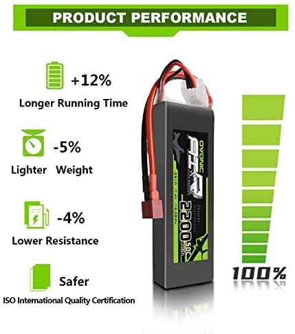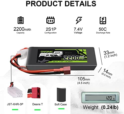 Specification – Ovonic 2200mAh 7.4V Lipo Battery Dimension(±3mm): 105*33*14mm / 4.2×1.2×0.5inch (L*W*H), Approx Weight(±5g): 120g / 0.26lb