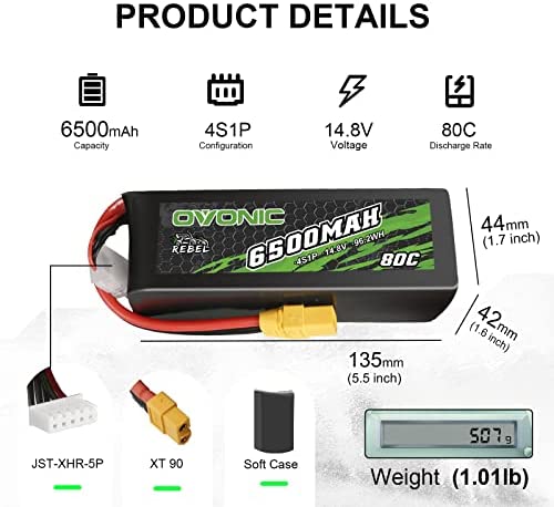 Specification- Material: Lithium polymer;Battery voltage: 14.8V ;Cell: 4S; Cell voltage: 3.7~4.2V; Capacity: 6500mAh; Discharge: 80C;Plug: XT90 Connector