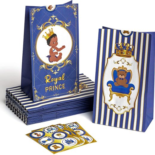 PANTIDE 24 Packs Royal Prince Goodies Candy Treat Bags with Stickers African American Baby Boy Birthday Blue and Gold Party Decoration Favors Supplies Bags Little Prince Gift Bags for Boy Baby Shower