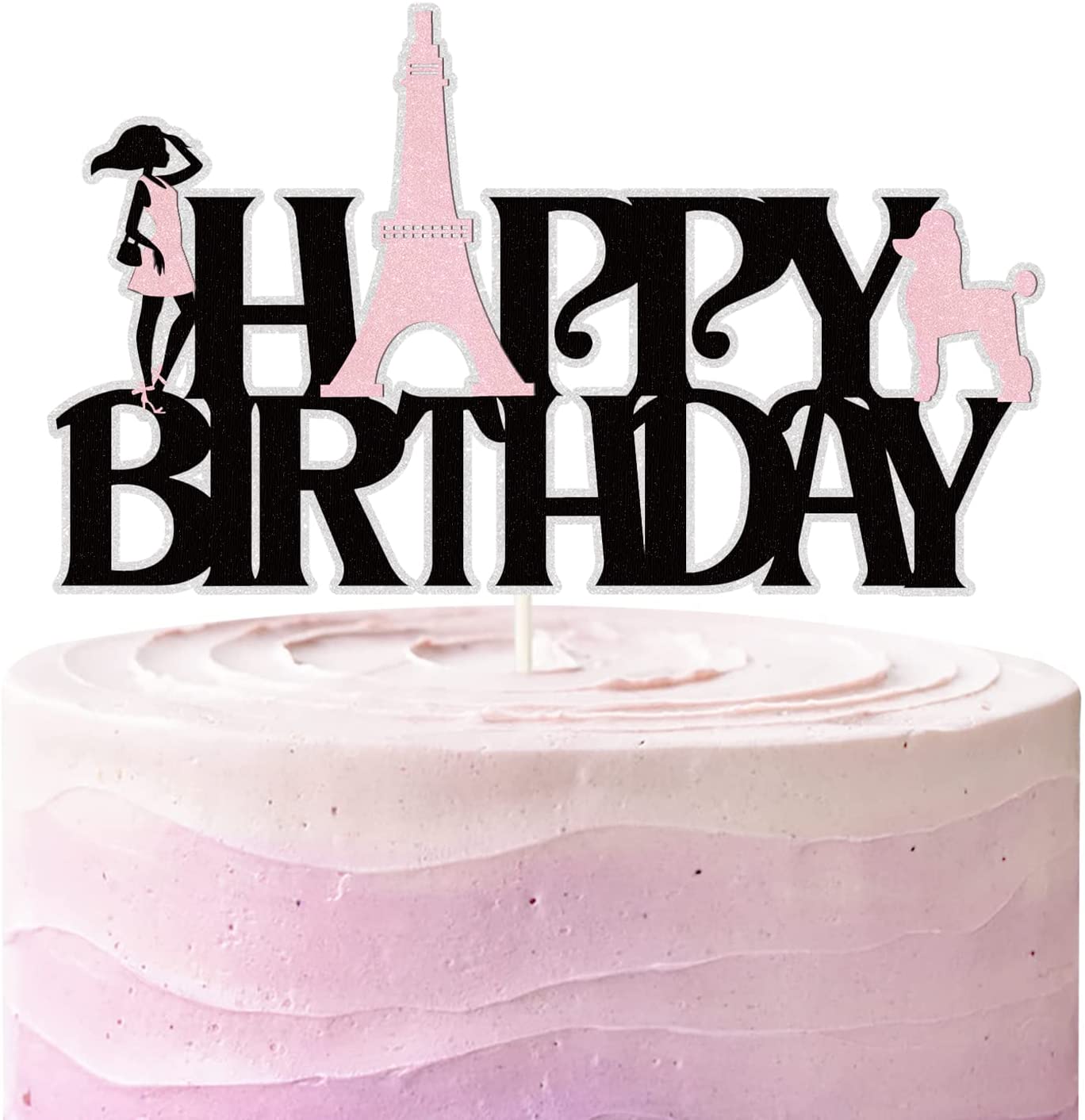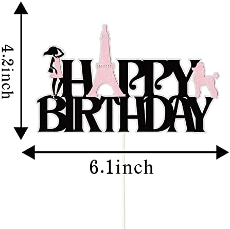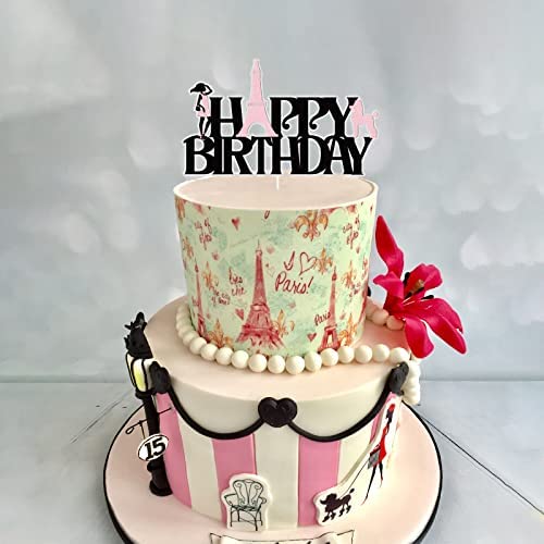 Paris Birthday Cake Topper,Happy Birthday Eiffel Tower Cake Topper for for Girls Lady Paris Theme Birthday Decorations,Paris Party Supplies,1Pcs Black Pink