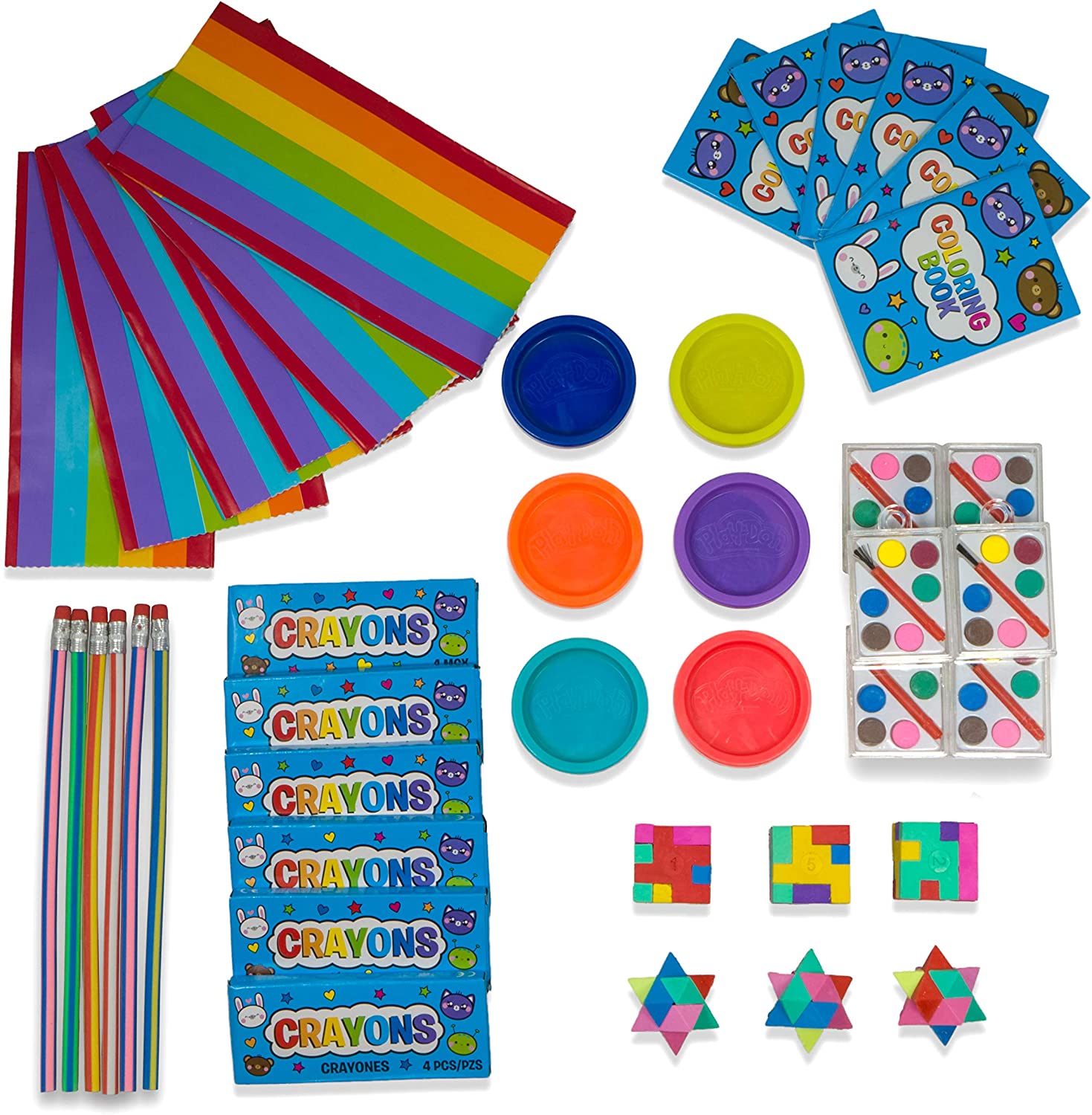 Creative Theme Party Favor Kit by Gudigear Unleash the artists with our goodie bags of fun. Why are our party favor kits Convenience of having everything you need for perfectly balanced goodie bags. Save time and money by not having to research and purchase items individually with our grab ’n’ go kits. Kid tested and high on quality, the toys will keep the little ones entertained while they make all kinds of colorful creations. Perfect for parties or the classroom. Kit Contains: 6 Rainbow gift bags 6 Fun size cans of Play-Doh (assorted colors) 6 Crayon sets (4 different colors in a set) 6 Pocket size coloring books 6 Mini watercolor paint pallet & brush sets 6 Puzzle erasers (3 star shaped and 3 cube shaped) 6 Bendy pencils (pencil sharpener required – not included) Recommended for ages 3+.