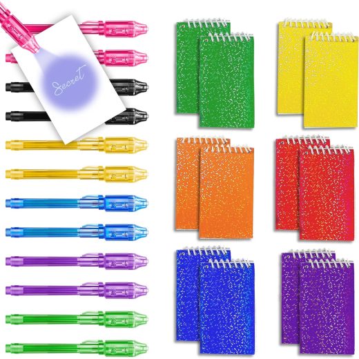 Kids party favors for 12 guests — includes (12) invisible ink pen with uv light + (12) mini notebooks for kids (2.5-inch x 3.5 inch) in rainbow colors Perfect party favors for kids 8-12 — used with any party supplies as complimentary party favors, valentines, birthday, easter kids gifts, classroom prizes, arts and crafts classes; also great as party favors for kids 4-8 Magic pens for kids party favors — write with the disappearing ink pen on the mini notepads. these amazing magic pens stay secret until glow in the dark pen light is pointed at it, great mess-free alternative to any coloring books Birthday party favors for any theme — use for dinosaur party; unicorn party; encanto birthday party; cocomelon party; paw patrol party; jojo siwa party; spiderman birthday party; frozen party; Minecraft party; starwars party; spy party; winnie the pooh party Multipurpose favors for kids — pinata filling, classroom prizes for students; christmas parties, advent calendars, halloween treats, pinata stuffers; easter basket stuffers; treasure box toys for classroom; great idea for wedding, party games for kid