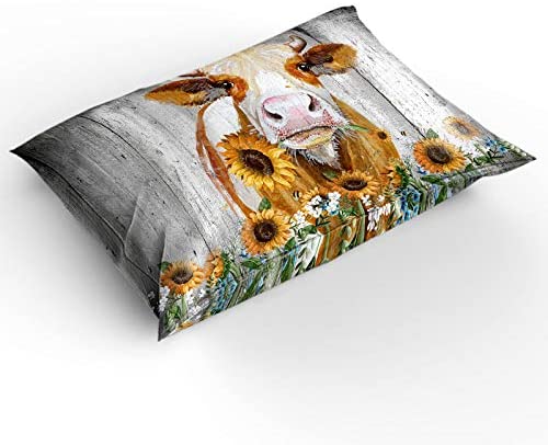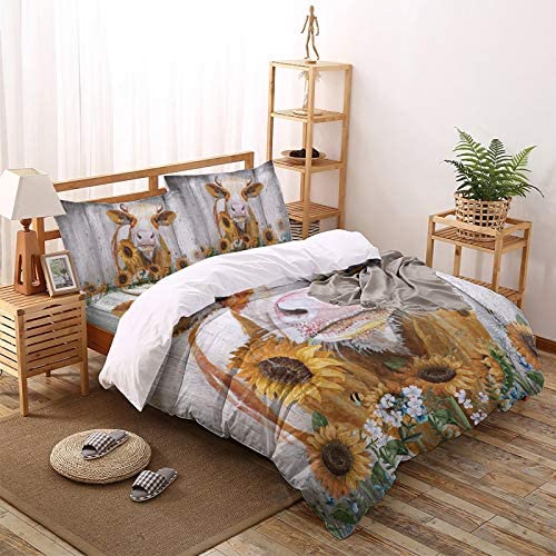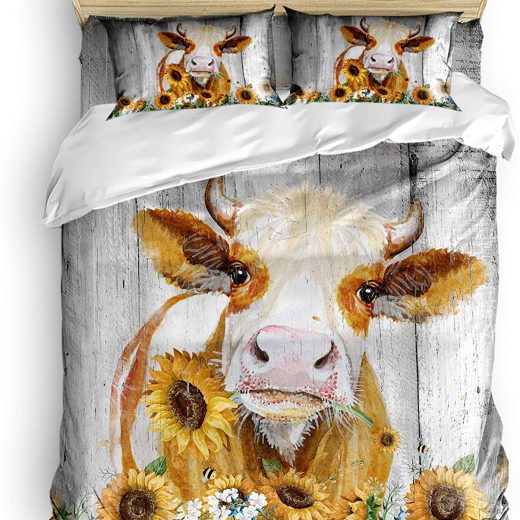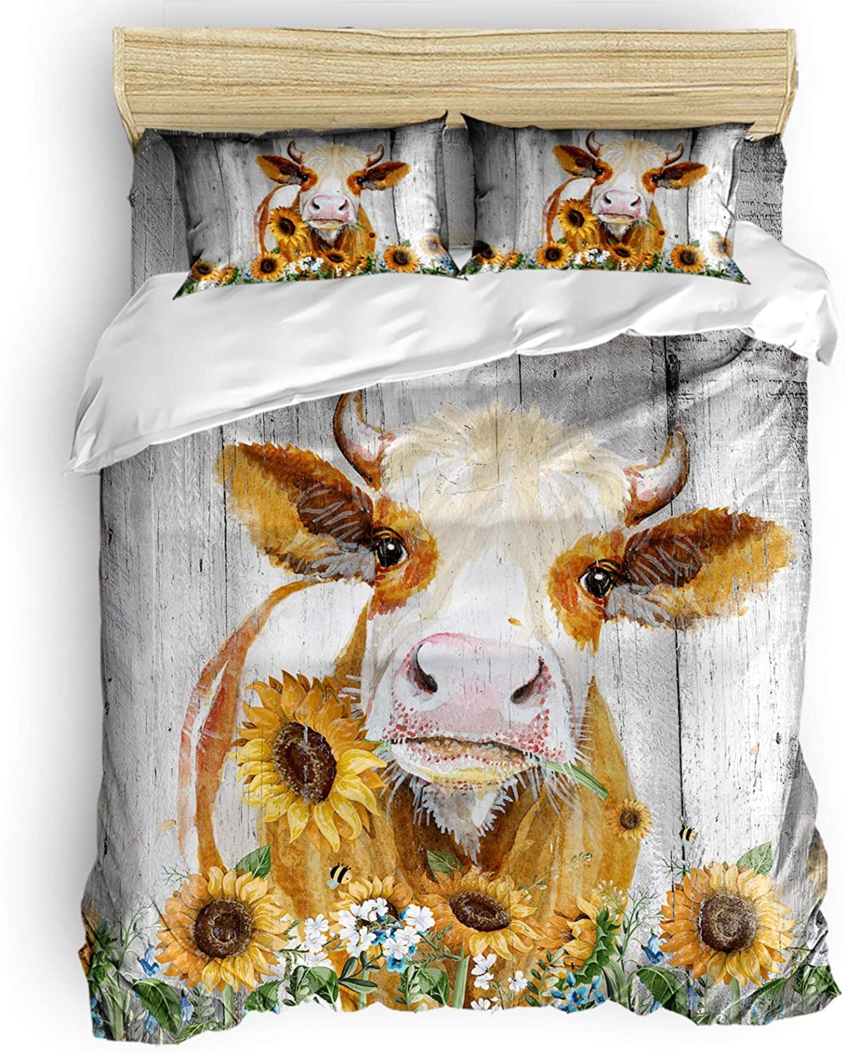PartyShow 4 Piece Bed Sets Full, Cute Cow with Sunflower Bedroom Comforters Cover Bed Sheet with 2 PC Pillowcases for Girls/Boys/Kids/Bedroom Farm Animal Retro