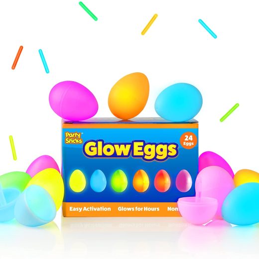 48 GLOW IN THE DARK EGGS: Play an exciting glow-in-the-dark Easter egg hunt with this bulk 48 pack plastic Easter eggs and 144 mini glow sticks in vibrant pink, yellow, blue, green, orange and purple colors FILLABLE GLOW EASTER EGGS: These glow in the dark plastic eggs can be stuffed with treats, prizes, mini toys, or insert the included mini glow sticks into each fake egg and start the fun glow in the dark egg hunt WATERPROOF FLOATING GLOW TOYS: Use these glow in the dark party favors as party decorations or use in the pool or during bathtime; these waterproof glow party supplies float, are non leaking, and nontoxic WEATHERPROOF GLOW IN THE DARK TOYS: Bring the party indoors or outdoors, these plastic glow in the dark eggs are waterproof and measure 2.5” L x 1.5” D; snap and shake the mini glow sticks to glow bright for 6-10 hours KID-SAFE AND QUALITY ASSURED: These nontoxic and non leaking glow in the dark party favors are safe and fun for kids ages 3 and up; We’ll provide a full refund if you’re not glowing bright with your glow sticks bulk party supplies