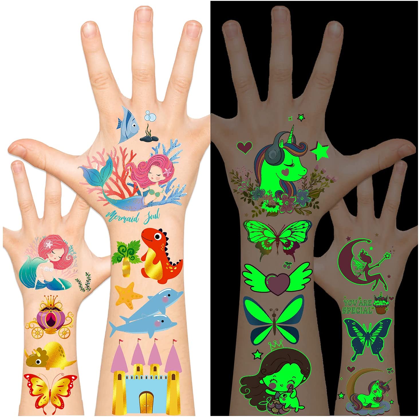 ?Kids Luminous Transportation Birthday Party Supplies?Luminous transportation themed temporary tattoos for kids. Even at a party with lots of people, these glow tattoos will make you unique in the crowd! These super fun elements of our cars fake tattoos include Cars, Tractor, Excavators, Fire Trucks, Ambulances, Airplanes, Taxi, Hot Air Balloons, and other favorite patterns that car lovers like! ?Simple to Use and Remove?Choose the one you like, and then face down on skin, wet the temp tattoo with water and wait for 10 seconds. Then gently tear off the white surface. You will get a luminous car tattoo! TIPS: Luminous tattoos need to be activated under light for a few minutes, which can make them more luminous in the dark. ?Waterproof and Long-lasting?Package contain 10 sheets (110 Style) luminous transportation theme temporary tattoos for kids boys girls, this means that every kid at the party can get a luminous and cute tattoo. Each sheet measures 4.8 x 2.8 . Our transportation temp tattoos undergo rigorous party testing, we guaranteed the fake tattoos will last all day. ?Applicable Place?These temporary tattoos are perfect for transportation cars birthday party supplies, construction/tractor party decorations, party favors, gifts for kids, games, pinata and so on. Are you looking for the perfect glowing party accessories? Our glow temporary tattoos is your good choice, which will add the fun of parties. There are many other super cute temporary tattoos for kids in our store. We also have Luminous series and Metallic Glitter series. Different theme include unicorn, circus, construction theme, dinosaur, luminous space theme, etc. If you need other party supplies, please click Partywind to enter the store to get more fun!