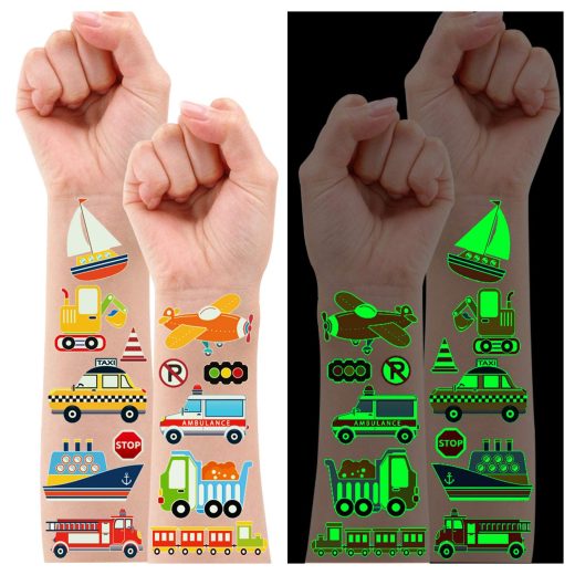 ?Kids Luminous Transportation Birthday Party Supplies?Luminous transportation themed temporary tattoos for kids. Even at a party with lots of people, these glow tattoos will make you unique in the crowd! These super fun elements of our cars fake tattoos include Cars, Tractor, Excavators, Fire Trucks, Ambulances, Airplanes, Taxi, Hot Air Balloons, and other favorite patterns that car lovers like! ?Simple to Use and Remove?Choose the one you like, and then face down on skin, wet the temp tattoo with water and wait for 10 seconds. Then gently tear off the white surface. You will get a luminous car tattoo! TIPS: Luminous tattoos need to be activated under light for a few minutes, which can make them more luminous in the dark. ?Waterproof and Long-lasting?Package contain 10 sheets (110 Style) luminous transportation theme temporary tattoos for kids boys girls, this means that every kid at the party can get a luminous and cute tattoo. Each sheet measures 4.8 x 2.8 . Our transportation temp tattoos undergo rigorous party testing, we guaranteed the fake tattoos will last all day. ?Applicable Place?These temporary tattoos are perfect for transportation cars birthday party supplies, construction/tractor party decorations, party favors, gifts for kids, games, pinata and so on. Are you looking for the perfect glowing party accessories? Our glow temporary tattoos is your good choice, which will add the fun of parties. There are many other super cute temporary tattoos for kids in our store. We also have Luminous series and Metallic Glitter series. Different theme include unicorn, circus, construction theme, dinosaur, luminous space theme, etc. If you need other party supplies, please click Partywind to enter the store to get more fun!