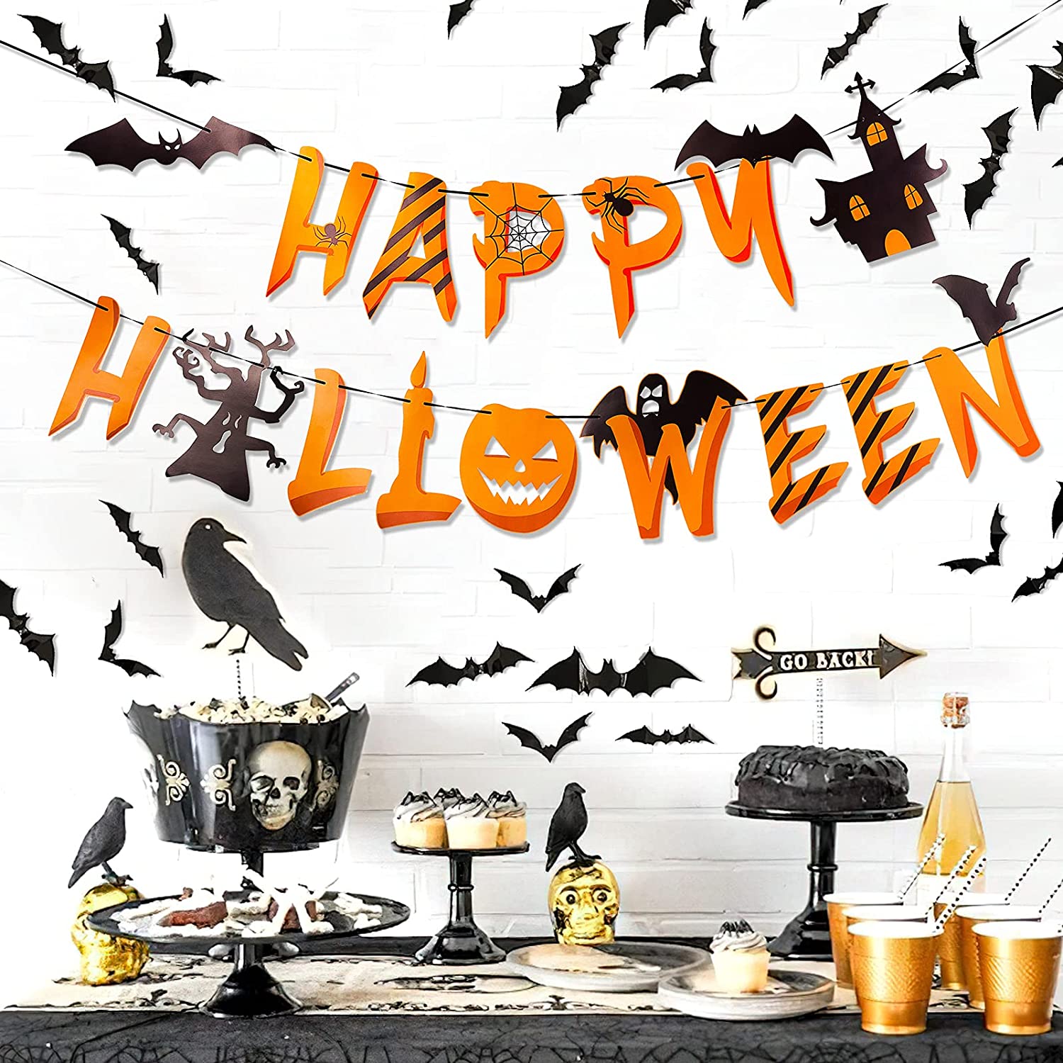 PartyWoo Happy Halloween Banner, 1 Set Halloween Bunting and 56 pcs 3D Bats Wall Decal, Halloween Garland with Ghost, Spooky Halloween Decorations Banners Hanging Decorations Clearance for Indoor