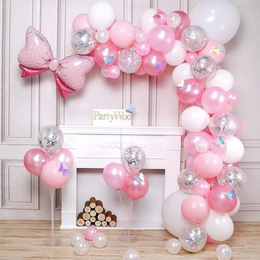 100 PCS PINK BALLOON SET: 5 inch pearl white balloons (15 pcs), pearl light pink balloons (15 pcs); 12 inch white balloons (10 pcs), pastel pink balloons (10 pcs), silver confetti balloons (10 pcs), pearl pink balloons (10 pcs), pearl light pink balloons (10 pcs); 18 inch white balloons (2 pcs); 58*89cm/ 22.8*35inch pink bow tie foil balloons (1 pcs); laser butterflies (10 pcs); balloon garland kit (7 pcs, manual included) NON-TOXIC & SAFE: ASTM (American Society for Testing Materials) certificated balloons, made of safe material. These pink balloons, white balloons, silver confetti balloons, foil balloon are ideal baby shower decorations for girl, girl baby shower decorations, first birthday decorations girl, 1st birthday girl decorations, birthday decorations for girls, pink party decorations, girl birthday decorations, pink birthday decorations, baptism decorations for girls, decorations for baby shower girl WHAT TO FILL WITH: These party balloons can be filled with air or helium. Latex balloons filled with AIR will stay full for up to 72 hours, with HELIUM will stay full for 3-6 hours. Mylar balloons filled with AIR will stay full for up to 30 days, while with HELIUM will stay full for 24 hours. Because our confetti balloons are filled with more confetti than ordinary confetti balloons, which may not float when inflated with helium, it is recommended to use air to fill the confetti balloons APPLICATIONS: These balloons are ideal baby shower decorations for girl, girl baby shower decorations, first birthday decorations girl, 1st birthday girl decorations, birthday decorations for girls, pink party decorations, girl birthday decorations, pink birthday decorations, baptism decorations for girls, decorations for baby shower girl, baby shower girl decorations, baby girl baby shower decorations, pink baby shower decorations, baby shower decorations girl, pink balloon garland kit ATTENTION & WARNING: Certain color difference occurs after inflation, but the color effect will be better. Please DO NOT overfill the balloons and also avoid sunburn, overheat, pointed object and excessive friction. Due to automatic packing system, please kindly note that any holes or popped balloon within 1-3 pcs for every 100 pcs pack of is a normal phenomenon. Using a pump to inflate these balloons is strongly recommended