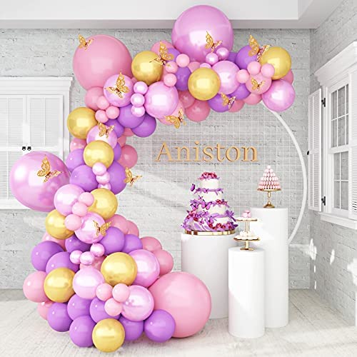 BUTTERFLY PURPLE PINK BALLOON GARLAND LIT INCLUDES, Total are 150 pcs. 18” metallic light purple, pastel pink balloons; 12” chrome lavender, gold c…