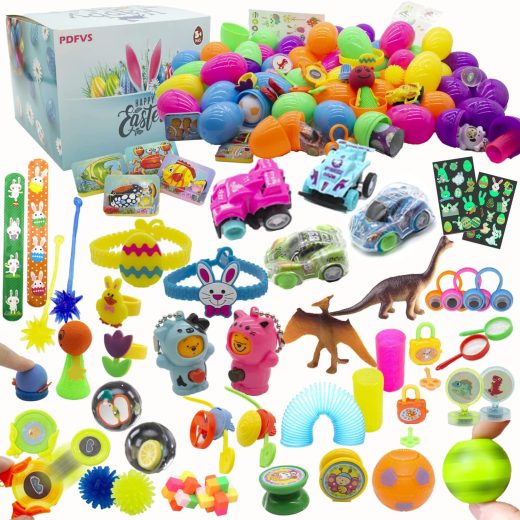 Easter Egg Super Value Pack 48 pcs bright plastic easter eggs including(yellow,green,purple,orange,pink,blue) 6 colors with 22 kinds of novelty toys and comes with easter glow temporary tattoos.Each easter egg measures 2.4in(6cm)high,including sticky hands,pull back car,ring, ruler,and dinosaur,etc. Convenient Easter eggs filled with toys will be perfect as a gift with this exquisite packing,save parentstime and money on preparing easter eggs holiday gifts for kids. Fun & Educational Toys Easter eggs toys as easter basket stuffers for boys and girls,easter toys are fun & affordable collectibles,kids will be delighted to discover the surprise in each easter egg they hunt. Safe Material for KidsOur Easter egg shells are made with thick plastic and excellent quality. All toys are environmentally friendly materials and without any smell. 100% quality assurance. Safe for child 3 years and up Great Party Supplies Perfect for easter egg hunting game, easter basket stuffers,easter theme party favor,easter gifts,themed party favor, parties prizes,school classroom activities rewards,prize box and more!