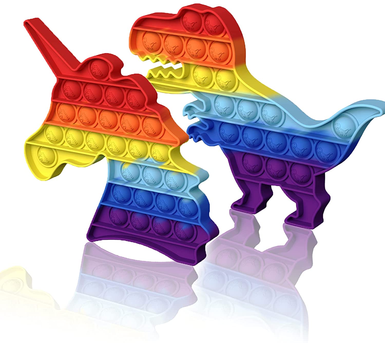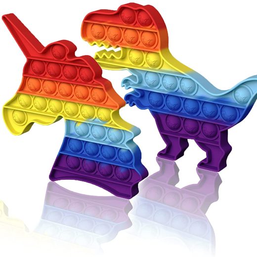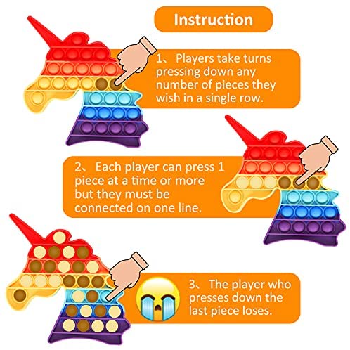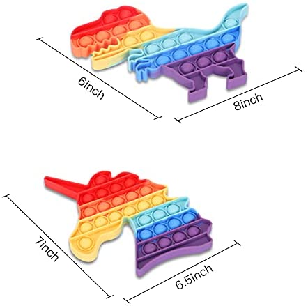 SPECIAL SHAPES- Each set has a 2 fidget toy in 2 animal shapes, one is dinosaur shape and the other is unicorn. Great for kids. ODORLESS AND DURABLE- This colorful Bubble Fidget Toy is made of safe, non-toxic, eco-friendly silicon. Which is safe for children, will not cause any harm to humans or pets. GAME RULE- Each player can press 1 piece at a line or more but they must be connected in one line. The player who presses down the last piece loses. STRESS RELIEF- This squeeze toy helps relieve stress and pressure, restore your mood, and create a comfortable atmosphere. Satisfy your friends, family and yourself. QUALITY CUSTOMER SERVICES- If you still have questions after your purchase, please contact us by e-mail. we will help you to solve problems within 24 hours. It is a best gift for friends and children. Best game toys in parties.