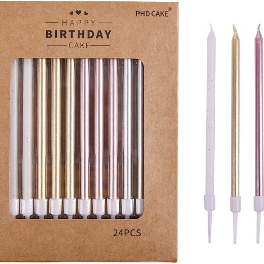 PHD CAKE 24-Count Long Birthday Candles in Holders in Gold Silver Rose Gold White, Cake Candles, Birthday Parties, Wedding Decorations, Party Candles, Celebrations