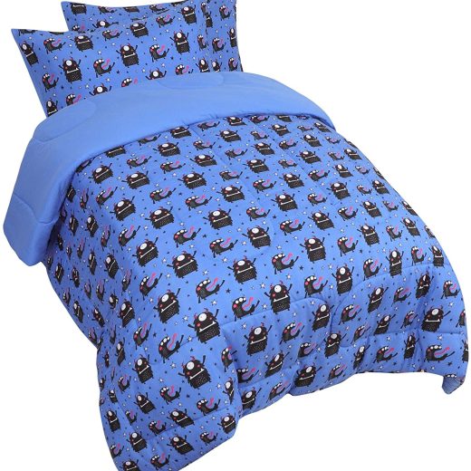 HIGH-QUALITY SOFT MICROFIBER: Our kids comforter set is made of polyester microfiber fabric and woven with the finest craftsmanship, which is durable and skin-friendly. The quilts are filled with 200gsm superfine polyester fiber for admirable warmth and comfort. With excellent tear resistance, moisture-wicking, and soft-touch making your prince or princess sleep comfortably every night! It is suitable for children who resist goose down and feather bedding in all seasons. MEET KIDS FAVORITE PATTERN: Our kids comforter and pillowcases are printed with solid blue on one side and some small black cartoon on the other. Your child can change the front and back sides as he or she likes. Designed by the renowned French design team – Dessin&Cie Studio. EXCLUSIVE CHILDRENS DESIGN: Our kids comforter is adopted the circular quilting process so that the filler is even and not easy to agglomerate, which can fix the comforter core and allow your kids various sleeping posture. The reinforced stitching on the edge of the comforter makes it more durable. EASY TO CLEAN & COMFORTABLE EXPERIENCE – It can be gently machine washable, dried at low temperatures, ironed at low temperatures, or dried. The child-friendly dyeing and printing process is not easy to fade and blur after repeated washing but does not bleached. PACKAGE INCLUDE:1 x FULL Comforter: 76x86inch, 2 x Pillowcases: 20x30inch.Its a wonderful gift idea for kids, teens, friends, boys, girls, sons, grandson, and so on. (We offer beautiful gift boxes that you can give to your children as birthday gifts.)