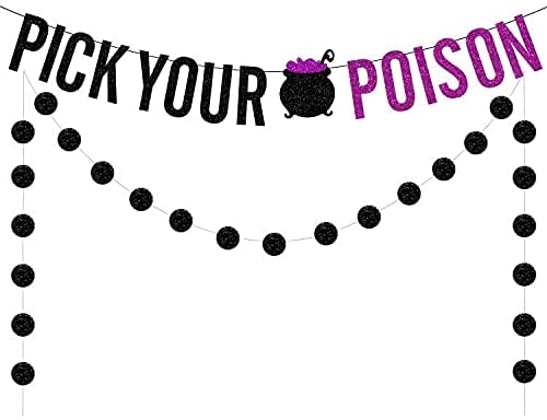 MZ.ogm Halloween Banner Package Includes : 1Pcs Black&Purple Glittery Pick Your Poison Banner with halloween poison bottle decor,Perfect for Halloween Party Decorations,1Pcs Black Glittery Circle Dots Garland.Awesome decoration to wonderfully add a festive atmosphere to your halloween and parties. Super Reliable Material: the Pick Your Poison halloween banner halloween party decoration is made of durable and reusable, the black glitter banner is made of quality cardboard, which is not easy to fall off, and the 3D Halloween posion is made of PVC, waterproof, fadeless and not easy to damage. Eye Catching Design: Not like the normal halloween banner, this frosted but glittering banner has a exaggerated font design and comes with black glittery words and posion, sure to create a horrific scene and fun atmosphere for your party.Perfect for Halloween Party Decorations,Halloween Party Supplies,Fireplace Mantle Home Decor,Yard Decor,Haunted House Decorations. Wide Application RangeThis Halloween theme decoration can be used in many occasions. You can hang it on mantelpieces, walls, fireplaces, backyards, doors, windows, branches, gates, and any place you like. Suitable for any Halloween theme party, horror scene decoration. Create a cheerful and unique atmosphere for your event. This will bring a huge surprise to your Halloween party and leave beautiful memories! MZ.ogm Pick Your Poison Banner 100% guarantee:If you are not satisfied with the Pick Your Poison Banner Halloween decoration, you can get a 100% refund unconditionally.
