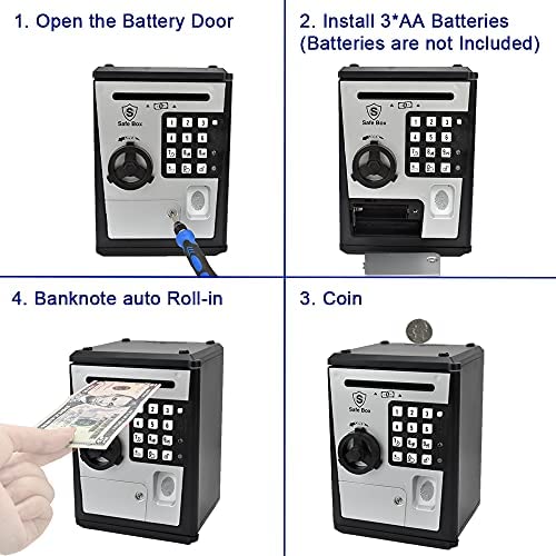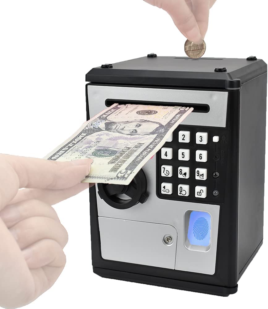1.Electronic Password Piggy Bank: Open the Piggy Bank Requires A 4-Digit Password + Fingerprint Confirmation, The Password Can Be Set by Yourself, The Initial Password Is 0000, Press the RESET Button to Reset the Password. 2.Large-Capacity Childrens Safe: The Inside of The Box Is Full of Storage Space, The Design Is Maximized, And Personal Items Such as Banknotes, Coins, Toys, Jewelry, Stationery, Mobile Phones Can Be Placed. 3.Auto-Rolling Banknote: Insert the Banknote into The Bill Port, And the Switch Will Be Triggered to Automatically Roll the Banknote In. Coins Can Be Inserted Through the Coin Port on The Top. 4.Voice Prompts: All Operations Are Available in English Voice Prompts, Easy to Operate Also Increased Interest. 5.Unpacking Record: You Can Check the Time of 3 Unpacking in The Past, Which Increases the Safety, Even If Someone Opens It, You Can Know It. 6.Voice Clock / Alarm: Alarm Clock and Voice Broadcast. 7.The Perfect Gift: Kids Will Love This Cool Savings. It Is Fun and Educational and Can Teach Children the Importance of Saving. It Is Your Best Birthday Gift, Christmas Gift, New Year Gift, Prize, Or Any Other Holiday Gift.