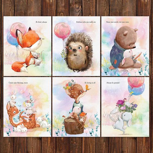 CUTE WOODLAND PRINTS – Set of 6 pictures of Woodland Baby Animals, featuring hand-painted Baby Forest Animals: Baby Fox, Baby Hedgehog, Baby Rabbit…