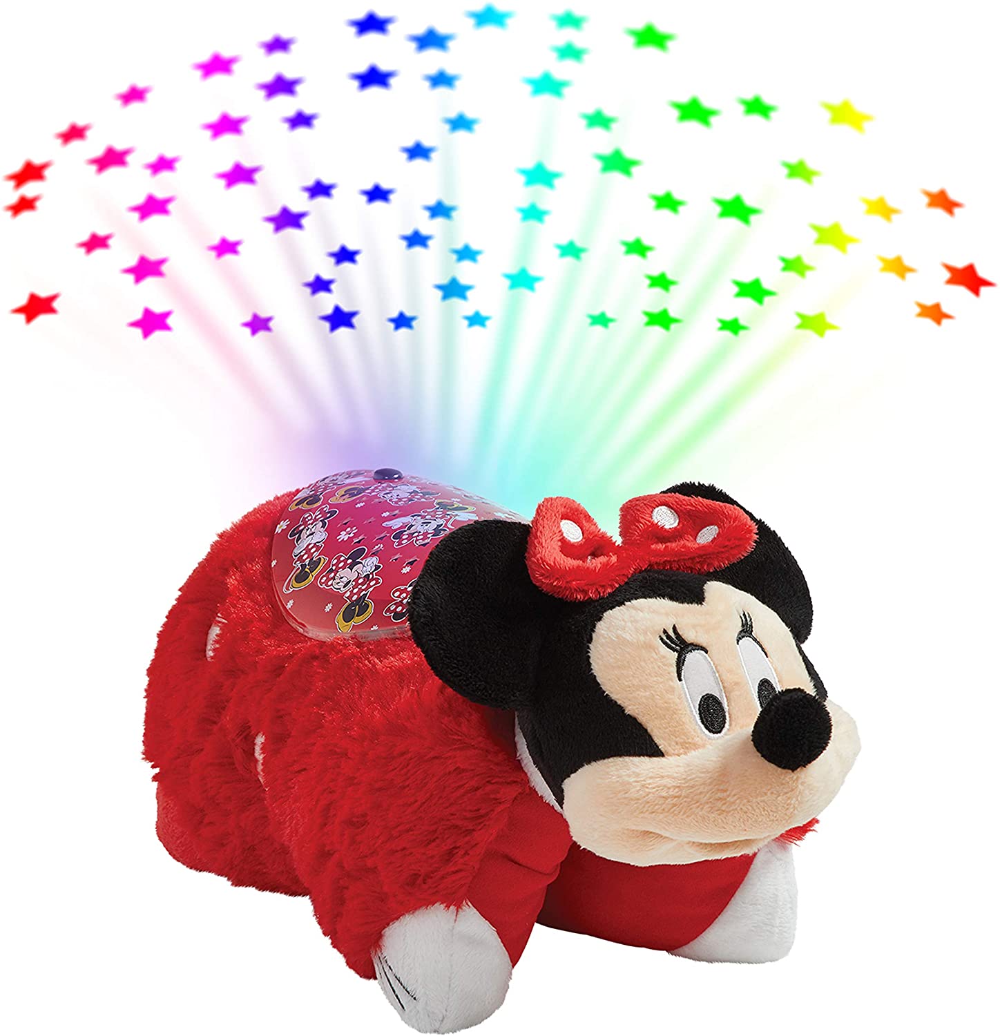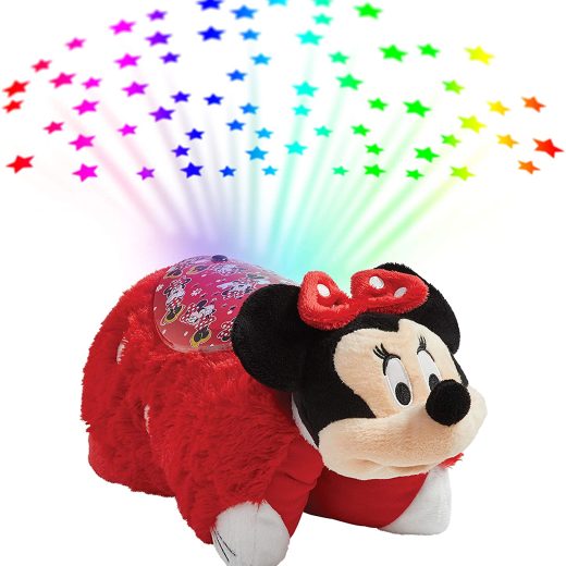 MINNIE MOUSE: The Sleeptime Lite Rockin the Dots Minnie Pillow Pet features Minnie’s dot style and lights up! This plush projects colorful stars. It’s perfect for Disney fans! LIGHT UP STUFFED TOY: Its a night light and plush toy in one! It acts as a night light with an artistically designed glowing light cover while projecting rainbow star display onto the ceiling. COMFORT: This plush is a pal by day, and comforting light at night. It also includes 3 light modes & built-in timer that shuts off after 20 minutes, just enough time for little ones to fall asleep. BEST BUDDY: Boys & girls will feel more comfortable and fears of the dark are eased with this cozy creature. Theyre great when travelling to give a sense of security to small children. SPECS: Official Pillow Pets item. Made with the softest and highest-quality plush; BPA & Phthalates free. Surface wash only. Projects light with 3 color modes and 20 min timer.