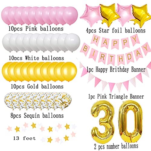 Pink and Gold 30th Birthday Party Decorations Set- Pink Happy Birthday Banner,Foil Number Balloons,Latex Balloons,Triangle Banner and More for 30 Years Old Brithday Party Supplies
