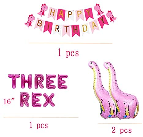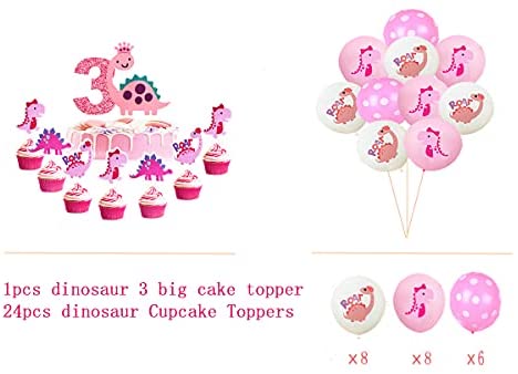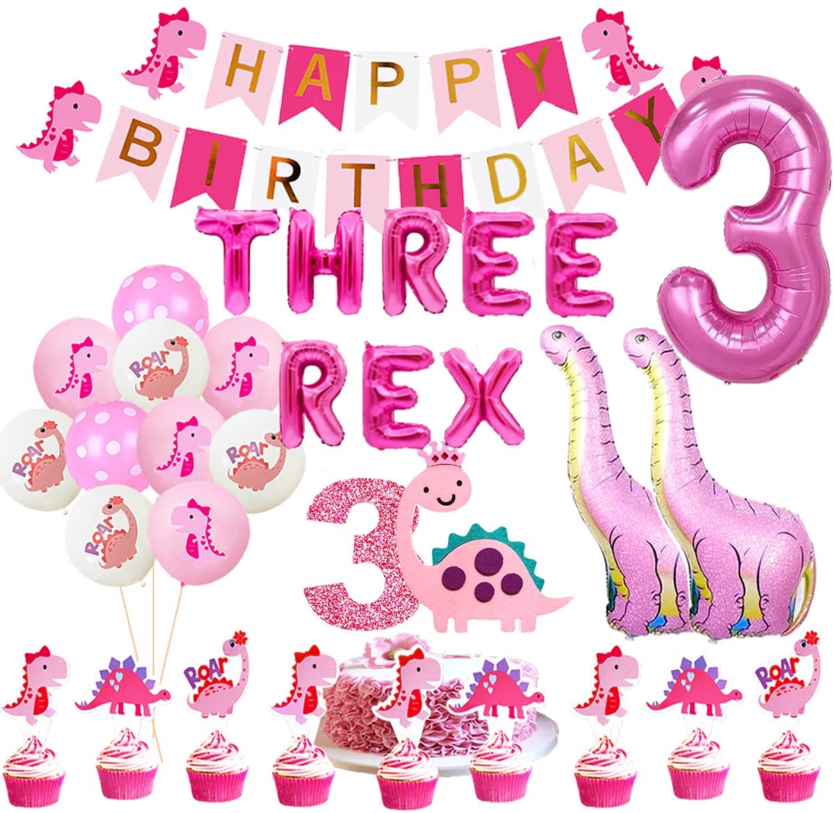 Pink Dinosaur Party Supplies For Girls 3rd Birthday Decorations Pink Three Rex Dinosaur Balloons Banner Dino Cake Topper Cupcake Toppers Girls 3rd Pink Dinosaur Decor
