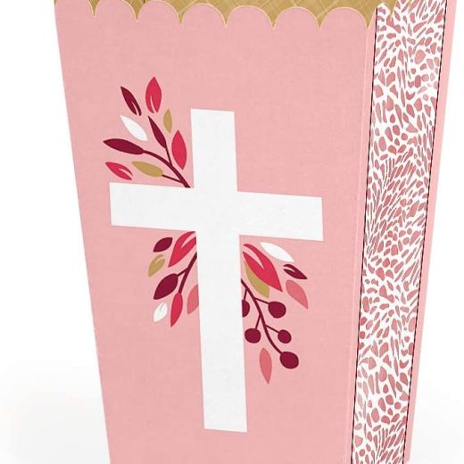 Pink Elegant Cross Favor Popcorn Treat Boxes INCLUDES 12 religious party favor boxes. Pink Elegant Cross treat boxes are perfect for any event. The girl cross theme is great for a baptism, Christening, first communion, confirmation or baby dedication party. Pink Elegant Cross favor popcorn treat boxes SIZE 5.75 inches tall x 3.5 inches square at the top. The unique design and large size makes these 12 girl religious popcorn boxes a must-have for any baptism, Christening, first communion, confirmation or baby dedication party. POPCORN BOX PARTY SUPPLIES: Pink Elegant Cross popcorn boxes will hold a variety of party food. Fill them with sweet treats or salty snacks. Popcorn, caramel corn, candies and other goodies will look amazing on your candy buffet with these cross favor boxes. PREMIUM PARTY FAVOR BOXES: Pink Elegant Cross treat boxes are professionally printed on heavy-duty cardstock paper with a photo-like shine. They are hand-folded and individually inspected, then carefully packaged. Popcorn boxes will arrive flat. Easy assembly is required. MADE IN USA: Pink Elegant Cross – Party Favor Popcorn Treat Boxes are designed and manufactured at our Wisconsin facility using materials that are Made in America.