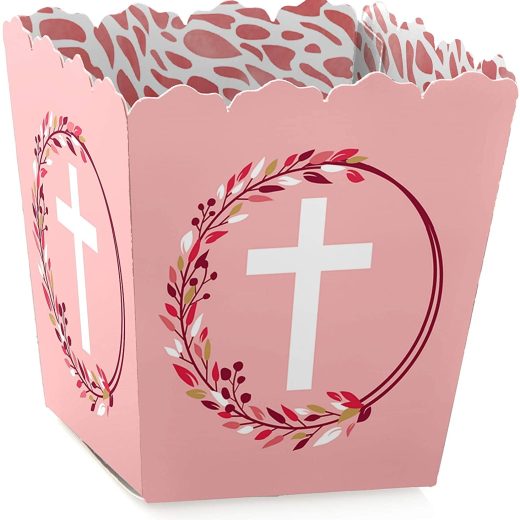 Pink Elegant Cross Mini Candy Boxes INCLUDES 12 religious party favor boxes. Pink Elegant Cross mini candy treat boxes are perfect for any event. The cross theme is great for a baptism, Christening, first communion, confirmation or baby dedication party. Pink Elegant Cross favor mini candy boxes SIZE 2.75 inches tall x 3 inches square at the top. The unique design makes these 12 girl religious party favor boxes a must-have for any baptism, Christening, first communion, confirmation or baby dedication party. CANDY BOX PARTY SUPPLIES: Pink Elegant Cross candy boxes will hold a variety of party food. Fill them with sweet treats or salty snacks. Candies and other goodies will look amazing on your candy buffet with these girl cross party favor boxes. PREMIUM PARTY FAVOR BOXES: Pink Elegant Cross candy boxes are professionally printed on heavy-duty card stock paper with a photo-like shine. They are hand-folded and individually inspected, then carefully packaged. Candy boxes will arrive flat, partially assembled. Finishing assembly is required but it is easy. MADE IN AMERICA: Pink Elegant Cross – Mini Candy Boxes Party Favors are designed and manufactured at our Wisconsin facility using materials that are Made in America.