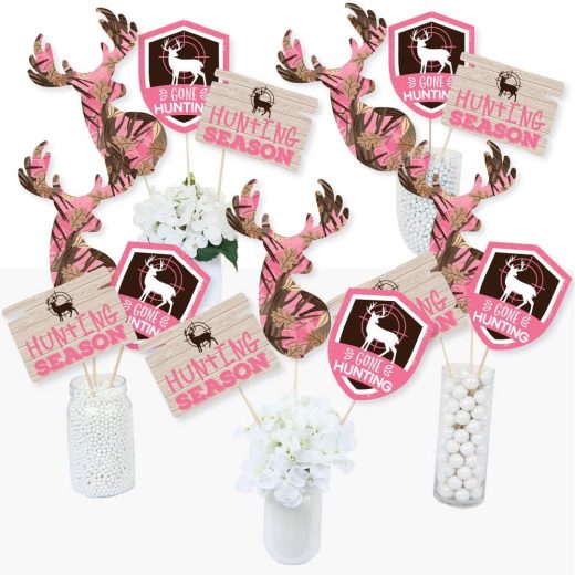 Pink Gone Hunting – Deer Hunting Girl Camo Baby Shower or Birthday Party Centerpiece Sticks – Table Toppers – Set of 15