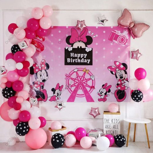 Perfect Arrangement- one piece of Minnie Happy Birthday backdrop 5×7Ft, 2pcs 18-in pink latex balloons, 73pcs 12-inch balloons (30 in light pink, 2…
