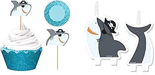 Pirate Shark Ocean First 1st Cake Candle PLUS 24 Matching Cupcake Picks and Glitter Blue Liners Decoration Party- 74 Pieces