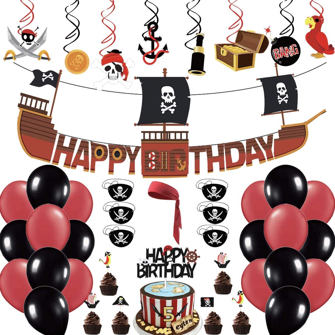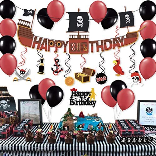 Pirate Themed Birthday Decorations Party Supplies Include Happy Birthday Banner Hanging Swirls Balloons Eye Mask Cake Toppers Head Band Great for Kids Boys Girls