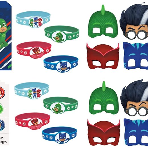 PJ Masks Birthday Party Supplies Favor Bundle Pack includes 8 Plastic Loot Bags, 8 Rubber Bracelets, 24 Tattoos, 8 Paper Masks, 8 Dionsaur Sticker Sheets.