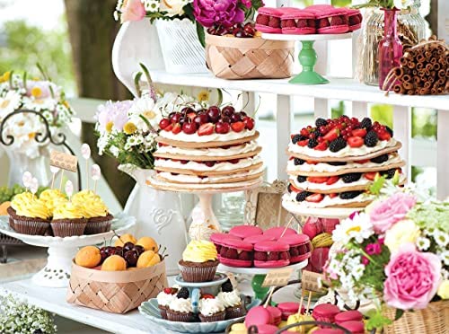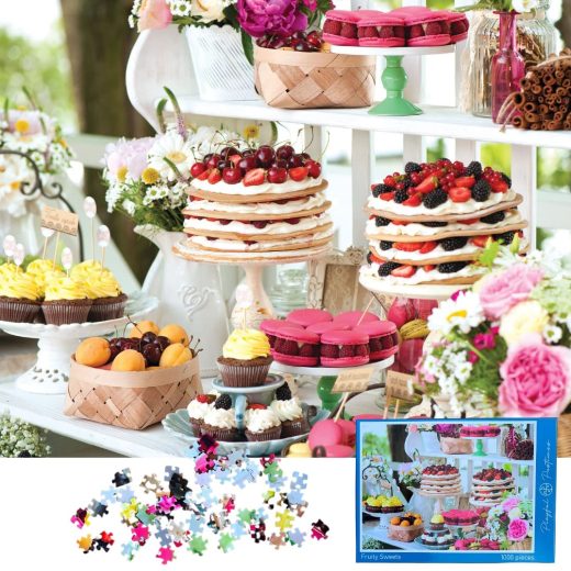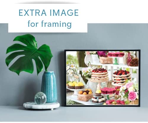EXTRA PRINT INCLUDED – High resolution 20cm x 27cm (8 x 10.5) high resolution print included for reference and framing This 1000 piece jigsaw puzzle measures 70cm x 50cm (27 x20) Box dimensions 30cm x 22cm x 5cm (11.75 x 8.6 x 2) THICK PIECES – Puzzle pieces are strong high-quality 2.34mm in thickness LUXE MATTE FINISH – Puzzle image features a non-glare luxe matte finish RECYCLED MATERIALS – Puzzle board and box board is made of 100% recycled cardboard This puzzle meets or exceed the requirements of CPSIA ORIGINAL IMAGE exploding with sweet stylings of fruit and pastries put together in an artful display.